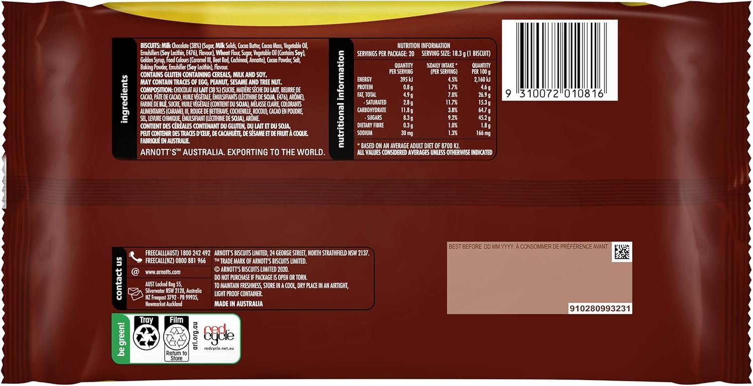 Milk chocolate (38%) (sugar, milk solids, cocoa butter, cocoa mass, vegetable oil, emulsifiers (soy lecithin, e476), flavour), wheat flour, sugar, vegetable oil (contains soy), golden syrup, food colours (caramel iii, beet red, cochineal, annatto), cocoa powder, salt, baking powder, emulsifier (soy lecithin), flavour.